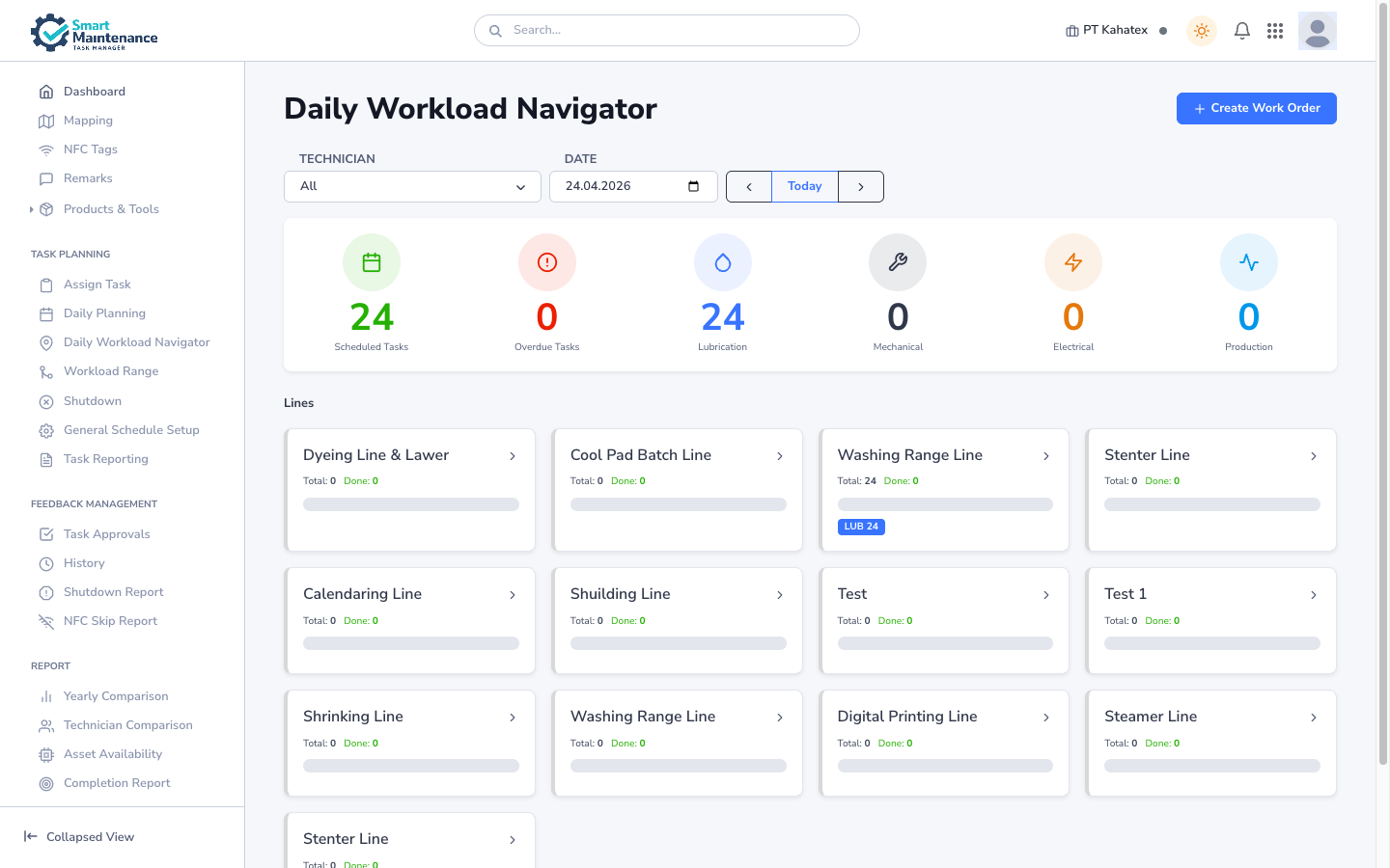 Daily Workload Navigator is the "where in the plant is today's work?" view. It focuses on a single day at a time and shows each production line as a card with task totals, done-so-far counters, a progress bar, and per-task-type indicators.