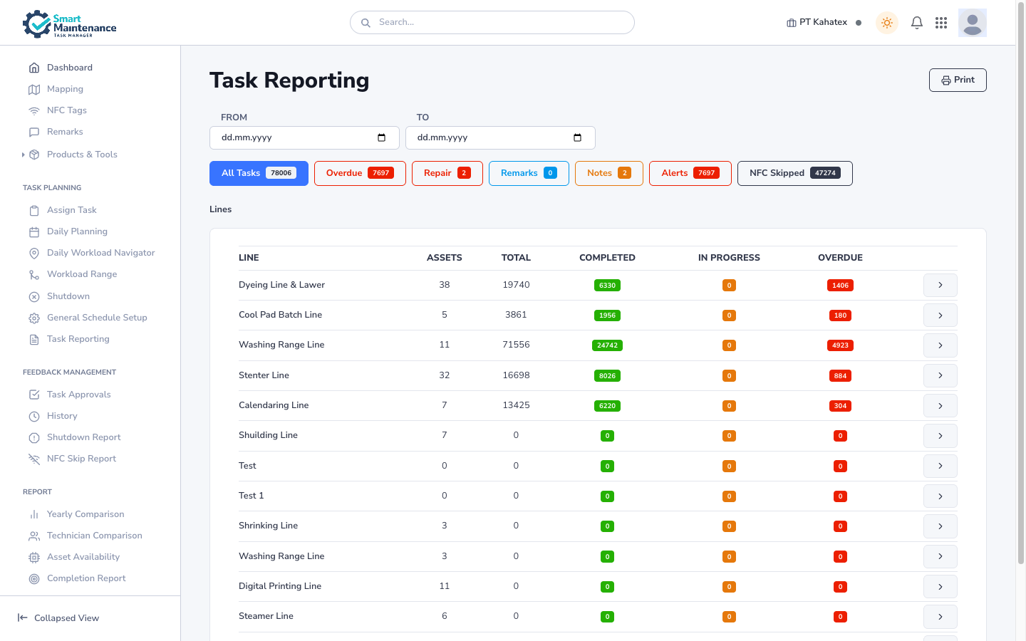 - Filters — site, line, technician, status, priority. Varies by report.