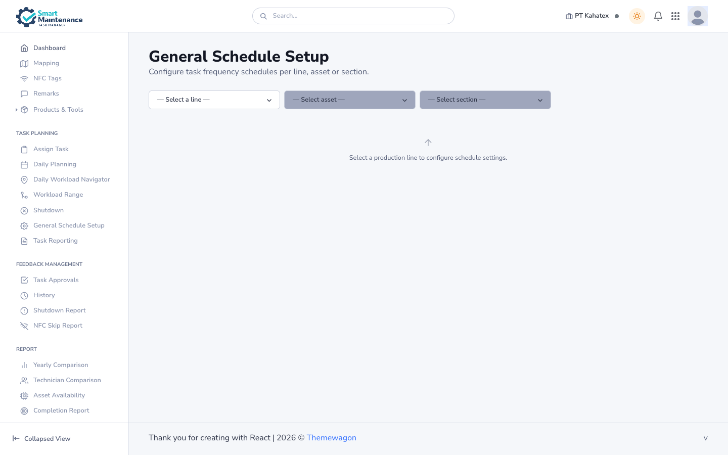 General Schedule Setup is where the scheduler's frequency is configured. Unlike a single flat list of schedules, the page uses a cascading drill-down: pick a Line → pick an Asset → pick a Section → configure. Each level scopes the schedules you see and edit to that part of the hierarchy.